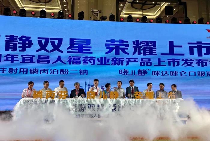 7月17日,宜昌人福药业注射用磷丙泊酚二钠(商品名:磷丙芬)、咪达唑仑口服溶液(商品名:晓儿静)全国上市发布会在武汉隆重举行。